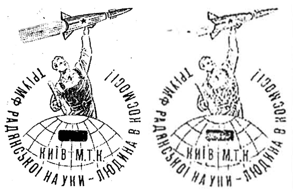 Naturally, preparation of the postmark must have begun much earlier, and that too seems plausible: the whole world knew about the race for space. Various sources report that the postmark had already been engraved in a Kyiv workshop in January 1961, so that only the date “12.4.61” needed to be inserted on the day itself (Kwasnikow/Tondrik). The production method is described either as zincography (Poznakhirko) or plastic engraving (Zaitsev).