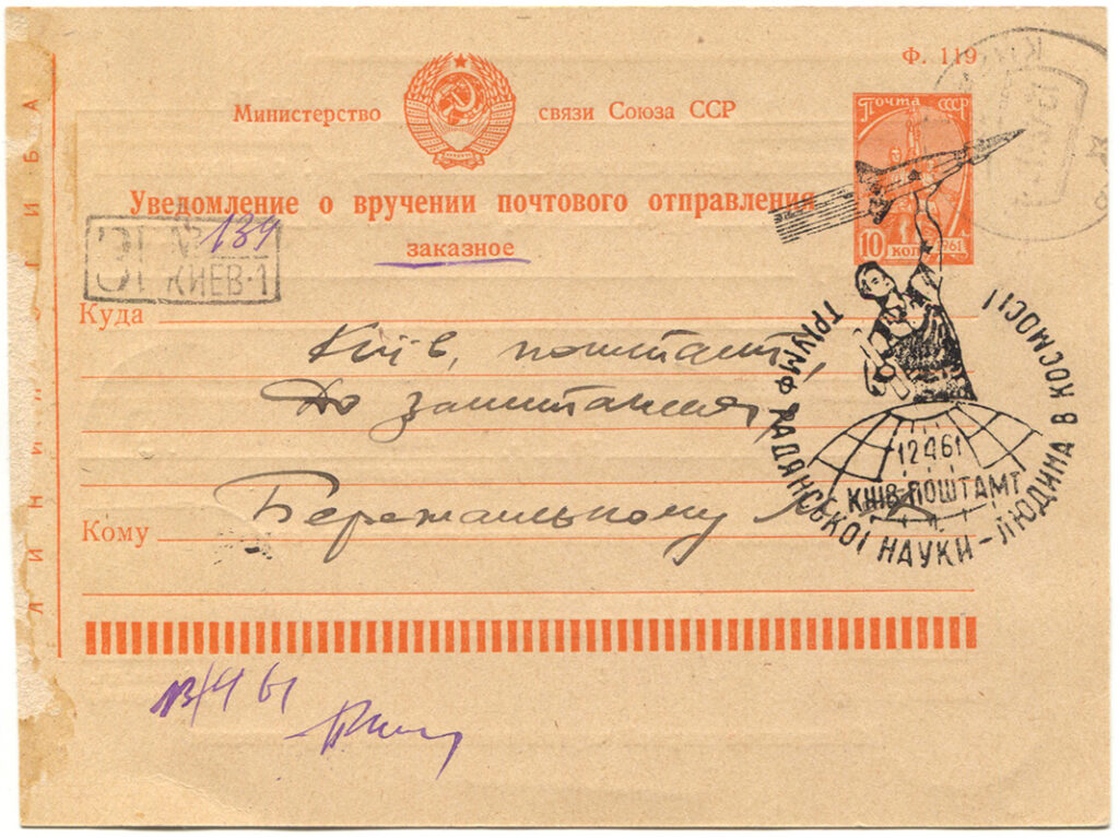 That anyone managed to introduce a special postmark at a postal counter on the very day of Gagarin’s flight struck Reichman as “a minor miracle or not possible.” Even more remarkable is that the impossible did not happen in Moscow, but in Kyiv. Still, it was not entirely out of the question. When the state news agency TASS announced to the world that the first human had orbited Earth, the time was 10:02 a.m. in both Moscow and Kyiv—the day was far from over.